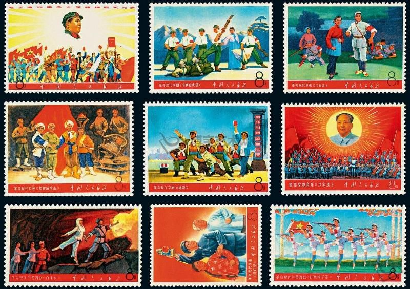 1968-1-30发行量1000万套全套面值0.72元,全套共9枚,市场价为7800元,1968 年2月 2 日邮电部专门为八个“样板戏”的诞生发行“文5” 邮票,新华社为之播发了千余字的消息,成为新邮发行史上最长的报道,“文5 ”邮票也因之成为文革邮票收藏热门中的“热门”。江青一伙的所谓“文艺革命”,实质上是文化专制。