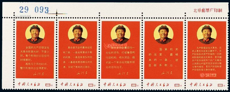 从“文革”邮票一问世起就宣告了发行长达18年之久的以“纪”、“特”字头为系列的邮票告一段落,代之的是无任何志号被称为“红海洋”的“文革”邮票,它作为一个特殊时代所产生的一个特殊邮票品种。