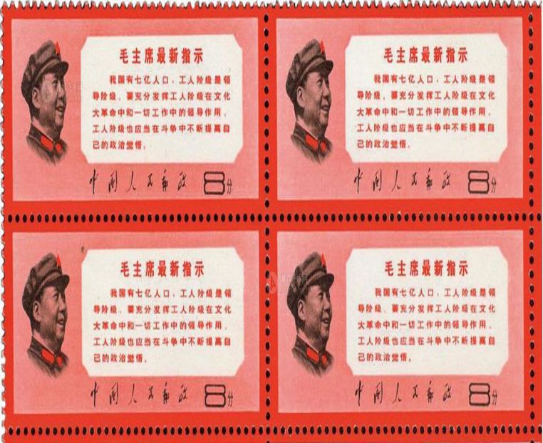 3、未发行票扑朔迷离:文革”邮票除80枚正式发行的邮票外,尚有许多未发行票流在市场上,其中最著名的是《全国山河一片红》,此外比之身价高数量少的还有毛主席与林彪在一起的《全国胜利万岁》、《大一片红》和《黑题词》等,所有的这些未发行票现已成为集邮界争相追逐的珍品。特别是《全国山河一片红》近几年频频在拍卖市场上亮相,其价格扶摇直上,屡创天价。